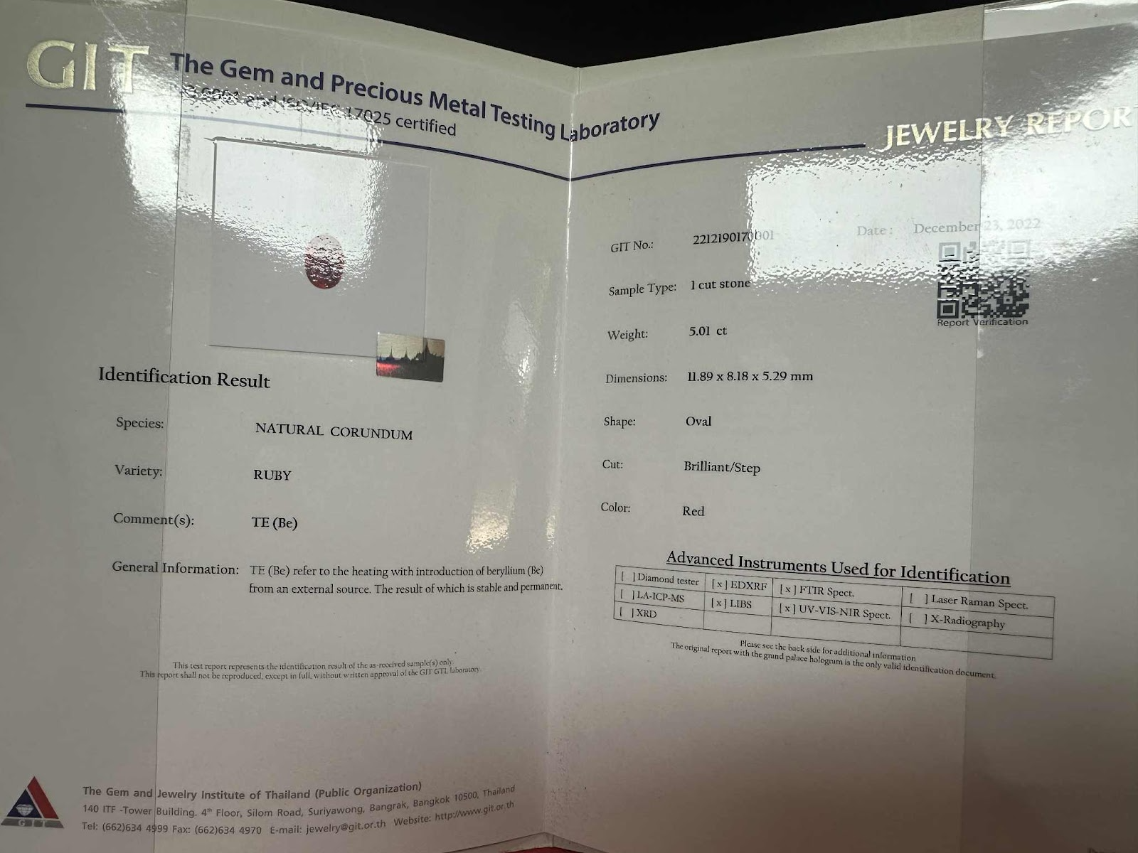 ตัวอย่างใบรับรองพลอยที่เผาเบริเลียมจาก GIT