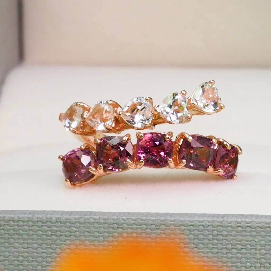 แหวนพลอย Double Band open ring สปิเนลพม่า ออมเบรโทนม่วง และพลอยโทแพซขาว